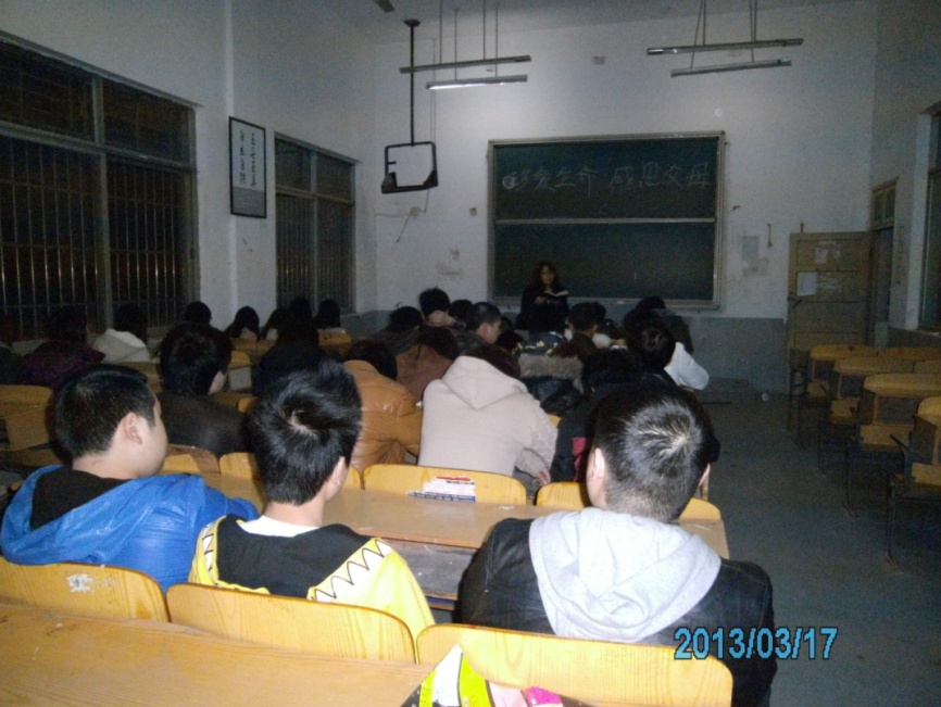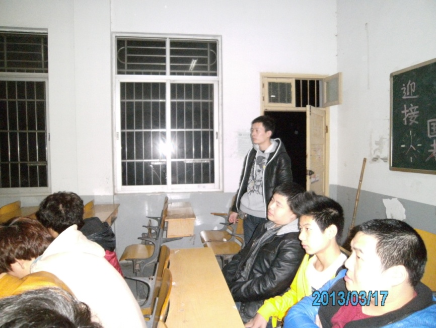 2013年3月17日晚上7点10分,校学工处胡仕雄老师来我院检查各班级“生命情感教育”主题班会的召开的情况。我院学生科科长孙峰老师全程陪同。