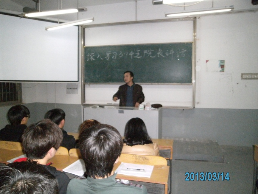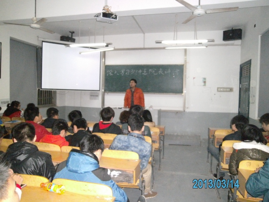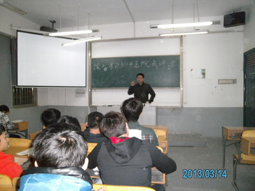 自从王江浩院长在2013年3月13日为200多名学生干部代表作了精彩的讲话后,我院各班级就掀起了“深入学习王院长3.13讲话精神”的热潮。