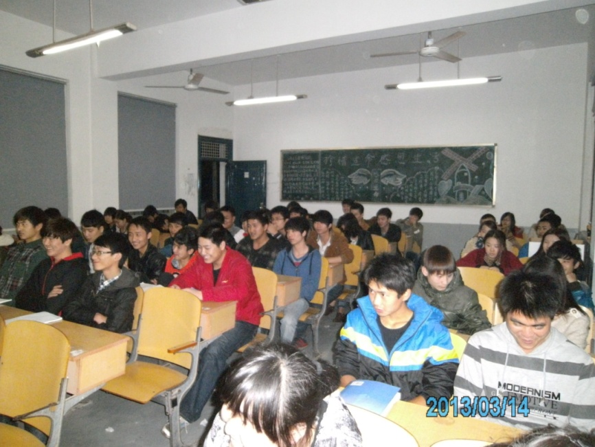 在工企1201班的班会上,班长邱建同学向大家报告道:王院长3.13的讲话内容主要集中在三个方面,一是我们学校目前在思考些什么,二是我们学院目前在思考些什么,三是我们自己应该思考些什么。