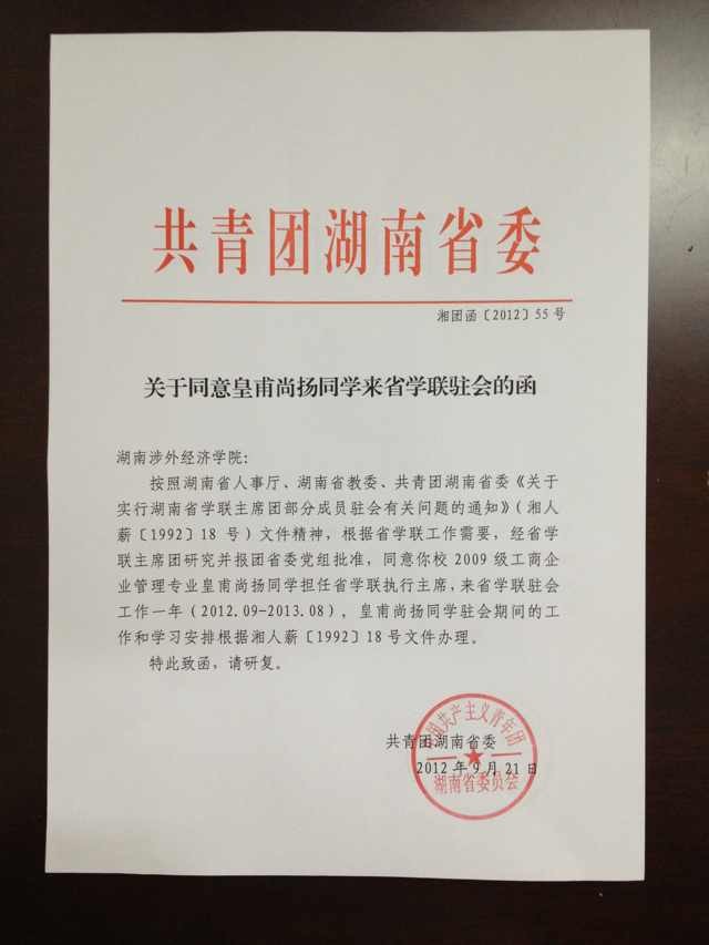 皇甫尚阳同学于2011年9月担任校学生会主席一职,在位期间秉承求真、务实的工作理念,对待学生工作花心思、花精力、花时间。带领校团委学生会全体干部迈着踏实的步伐,走到学生中去“知同学情、解同学难、暖同学心”,期间开展了多项团学活动,得到同学及教师们的一致肯定。特别在响应余孟辉副校长号召的“亮身份、比贡献、创优秀”活动中率先带头,在一定程度上改变了我校广大学生、学生党员、学生干部的学习生活不良习惯。在将近2个月的选拔和考察过程中于2012年9月顺利通过湖南省学生联合会驻会主席的选拔,现任湖南省青年联合会秘书处秘书、湖南省学生联合会驻会执行主席。